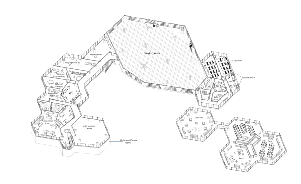 In this project i tried different type of creation process. So that, the shaping of the masses in the project and deciding their orientation have developed with the design and hegzogonal pattern sheet. Hexagonal and triangular forms in the pattern has been tried to be reflected in the design phase of the project.Especially, library and gift shop where stands for the mass reflects the pattern's form.